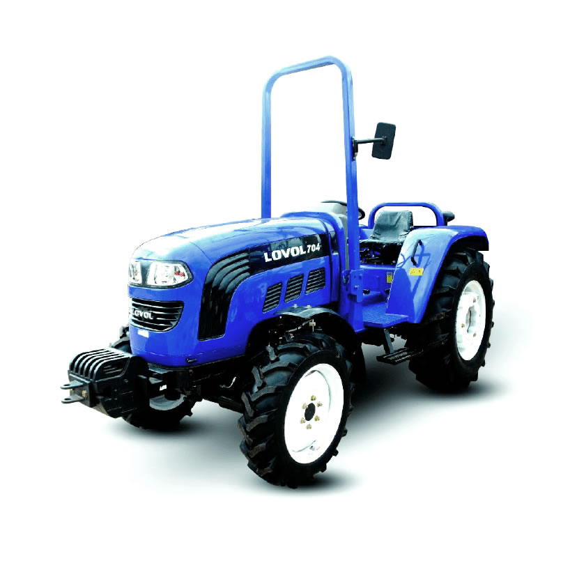 Tractor agrícola de 70 Hp doble tracción equipado con motor Xinchai A4K43T70 de aspiración natural, con arco antivuelco rebatible, embrague doble semi independiente para marcha y toma de fuerza, transmisión sincronizada 12F x 12R con inversor mecánico, filtro de aire seco incorporado de 2 etapas, asiento Grammer